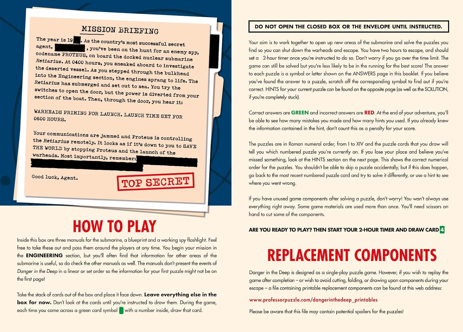 - Set contains: 22 Puzzle cards, Submarine blueprint, 3 Manuals, Spy flashlight and instructions.