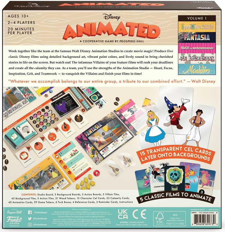 Work together like the team at the famous Walt Disney Animation Studios to create movie magic! Produce five classic Disney films using detailed background art, vibrant paint colours, and lively sound to bring cherished stories to life on the screen. But watch out! The infamous Villains of your feature films will rush your deadlines and create all the calamity they can. As a team, you’ll use the strengths of the Animation Studio-Heart, Focus, Inspiration, Grit, and Teamwork to vanquish the Villains and finish your films in time! Interesting Gameplay Features Lively, cooperative gameplay with unique player powers! Stunning components include full-colour player boards, custom wooden tokens, and 15 transparent cel cards. Explore the storied history of the Disney Animation Studios with five classic films! Develop sound, ink & paint, and background art- plus a bit of magic to bring your films to life! Game Details: Strategy game Ages 10 and up For 2-4 or more players 20-minute gameplay per player