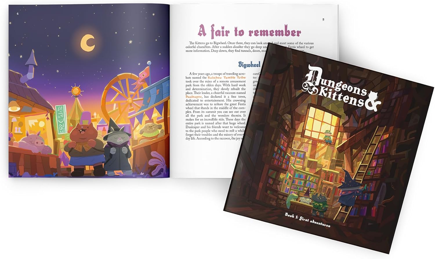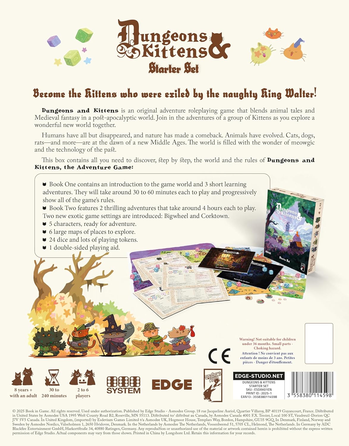 This box contains all you need to discover, step by step, the world and the rules of Dungeons and Kittens, the Adventure Game: