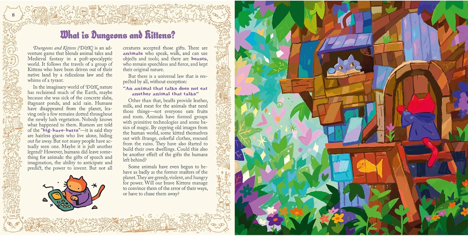 Dungeons and Kittens is an original adventure roleplaying game that blends animal tales and Medieval fantasy in a post-apocalyptic world. Join in the adventures of a group of Kittens as you explore a wonderful new world together.