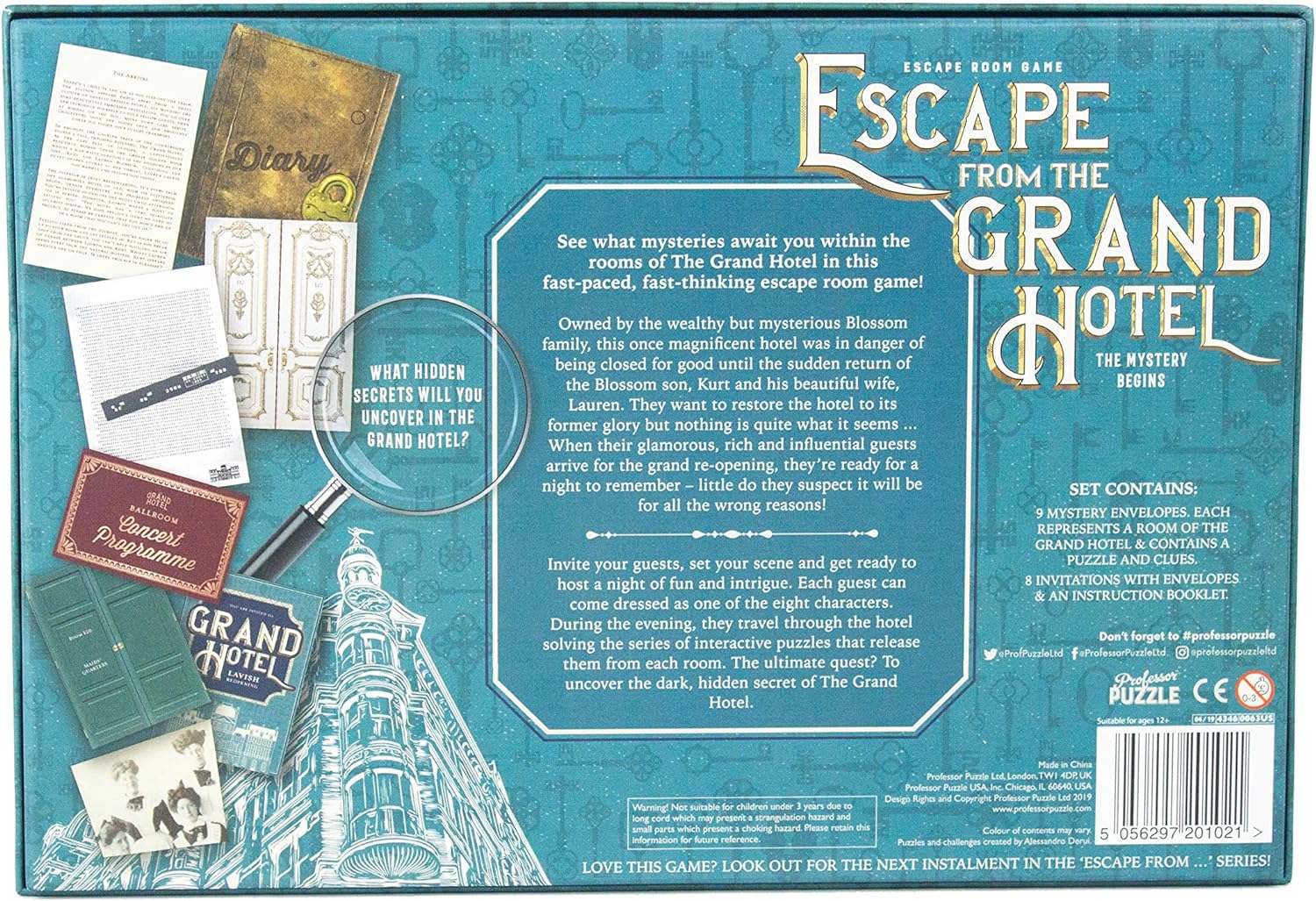 Invite your guests, set the scene and get ready to host a night of fun and intrigue. Each guest can come dressed as one of the eight characters, ready to play their role. During the evening, they must travel through the hotel solving the series of mysterious puzzles that release them from each room. The ultimate quest? To uncover the hidden secrets and escape from the Grand Hotel.