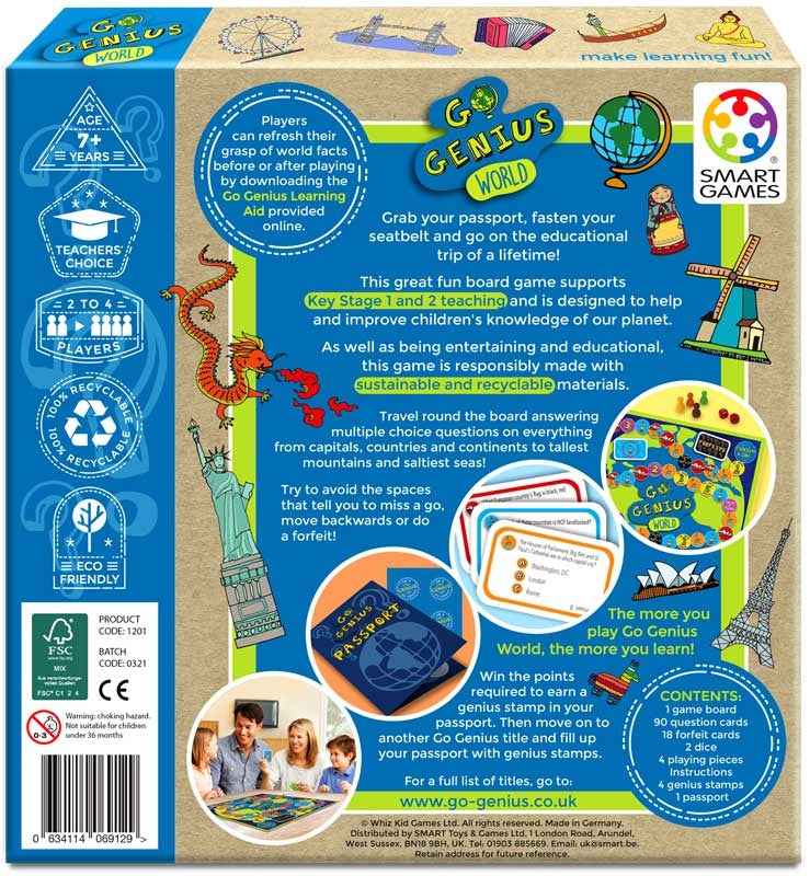 The aim of the game is to get as many points as possible. Players travel round the board answering questions on everything from capitals, countries and continents to tallest mountains and saltiest seas. They need to try and avoid the spaces that tell them to miss a go, move backwards or do a forfeit! Players who gain more than 15 points can put a genius stamp (provided) into their Go Genius passport (provided for children to personalise). Not everyone is a genius but the idea is the more you play the game, the more you learn.