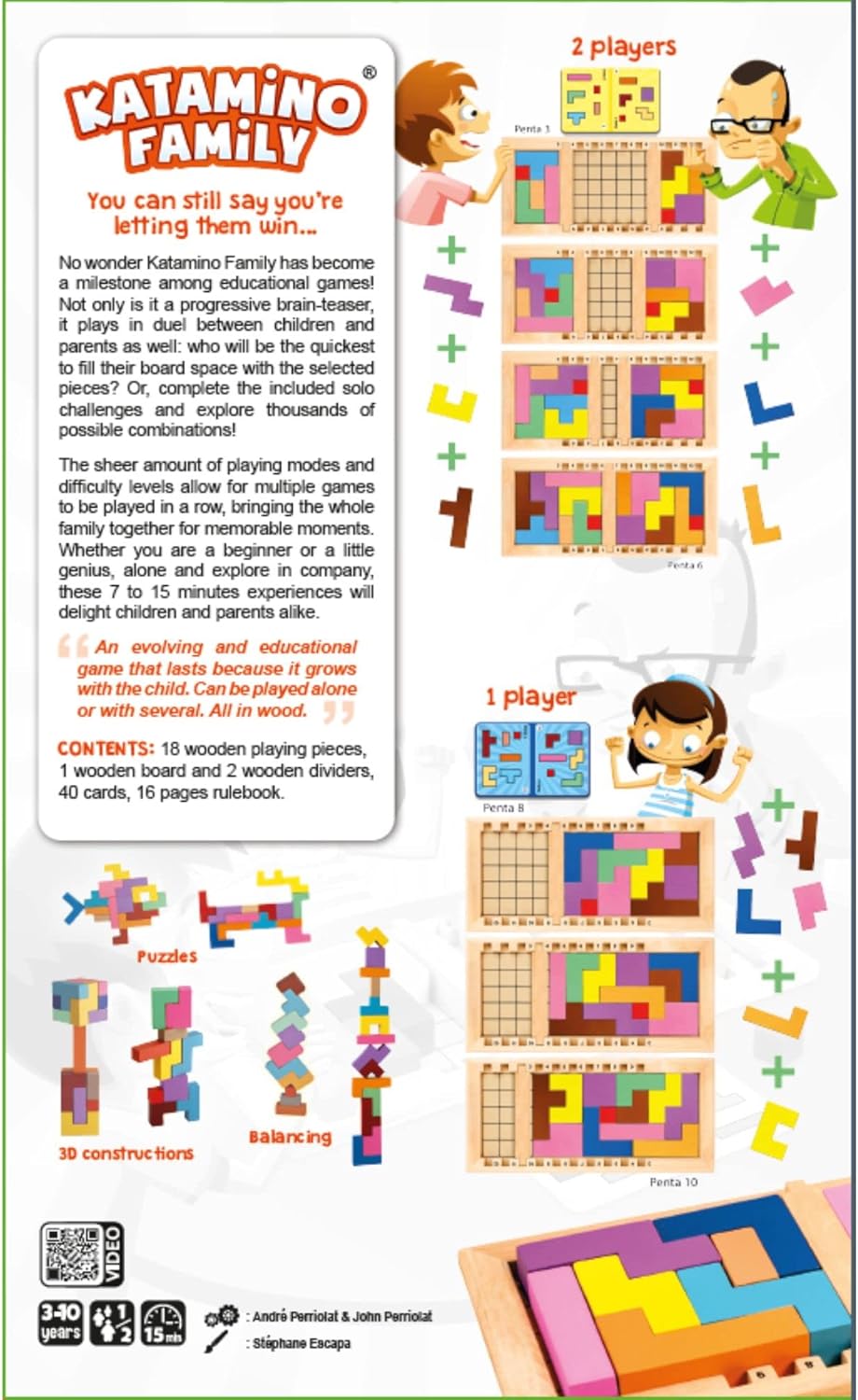 Geometric puzzles just got more fun in Katamino Family! Can you fit your pieces into the grid first? Using cards and easy to hold components, this even more colourful and accessible version is enjoyable for gamers of all ages!