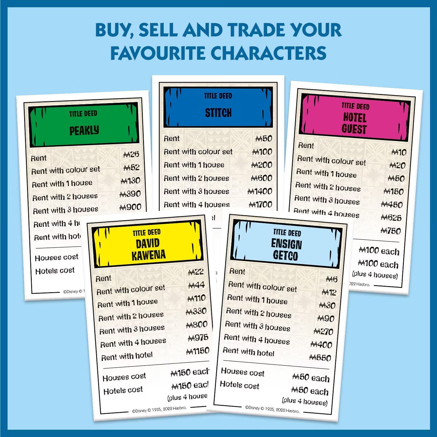 Buy, sell and trade your favourite characters from the hit Disney movie in this tropical twist on the classic board game. Take a chance with the special Experiment 626 and Hula cards as you shimmy your way across the Big Island with Lilo, Nani, Stitch, Peakly, Jumba and many more, building houses and hotels as you go.