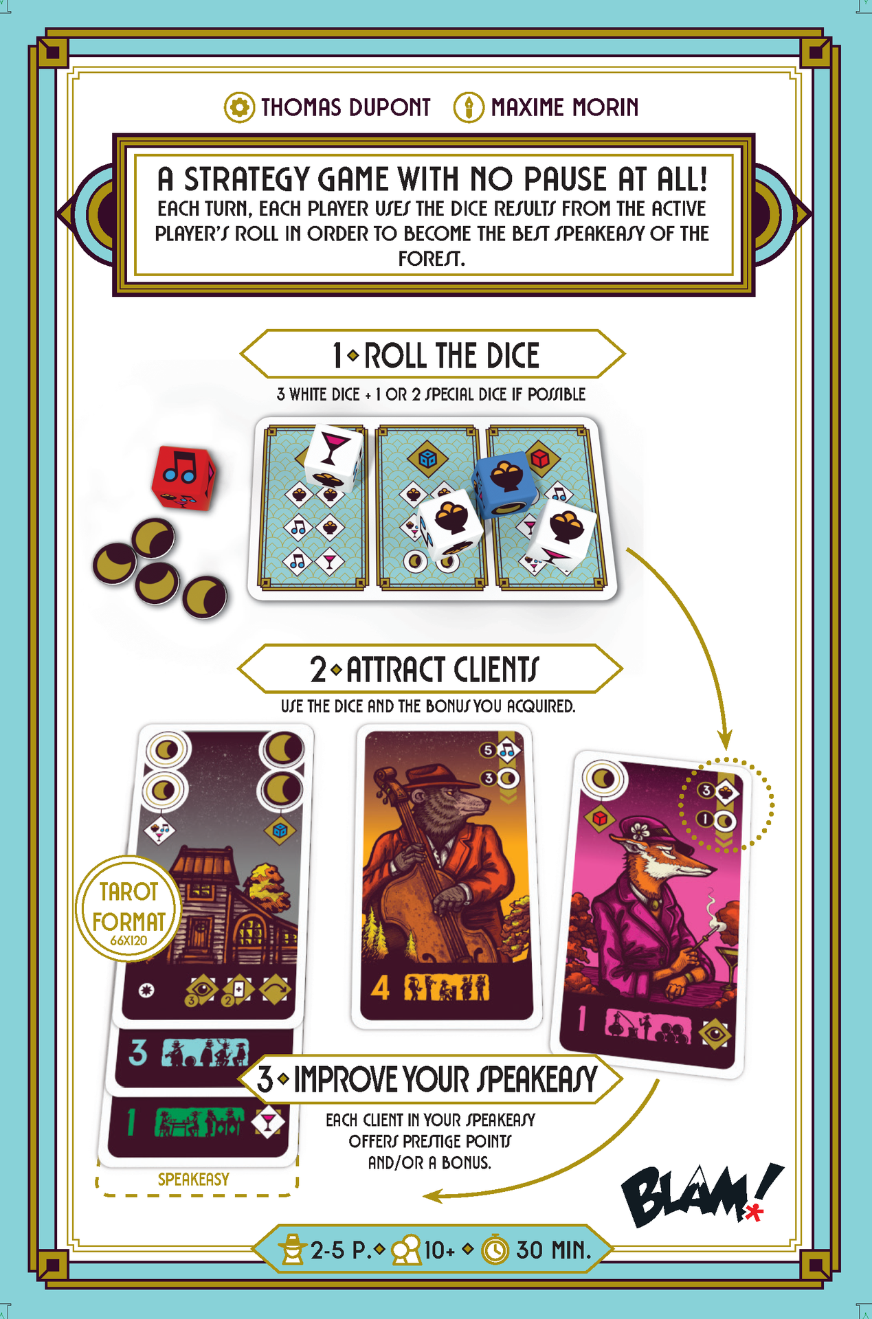 Moonshine is a dice-based engine-building game in which players play simultaneously. On each turn, each player exploits the dice results obtained by the active player for their own purposes, in order to enhance the appeal of their speakeasy. The aim of the game is to attract enough customers to reach 12 prestige points. When a player achieves this, the game ends and the player with the highest score wins.