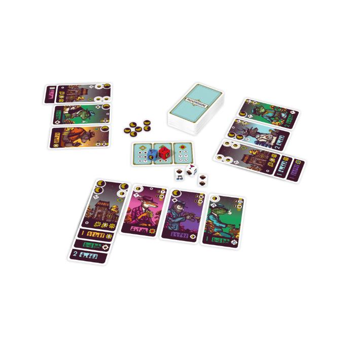 A game consists of a succession of rounds, all of which take place in the same way: first, the active player rolls - and possibly re-rolls - all the dice to which he has access, to validate a pool of dice. Each player then disposes of the resulting icons as they see fit. These icons represent prohibited resources prized by potential customers (each player has their own potential customers). By satisfying a customer's specific needs, they enter the bars and benefit from the permanent bonus: prestige points, resource icons, access to other dice (blue and red dice), to raises, to other potential customers, etc. If ever a player doesn't want to or can't exploit the dice result, they are not stuck! They can either pick up a Moon token to place on one of their cards to unlock a temporary bonus or replace one of their potential customers with a new one.