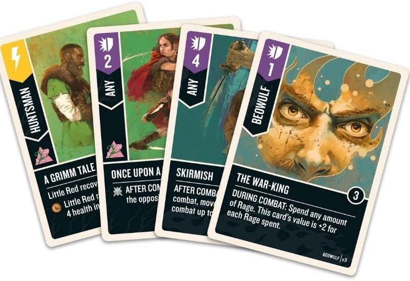 Each character has a unique deck that fits their fighting style. Little Red Riding Hood features a clever card-combo mechanism. Matching icons on the cards she plays to the ones in her ‘basket’ (discard pile), triggers potent effects. Beowulf uses rage to power up his cards for devastating effects.